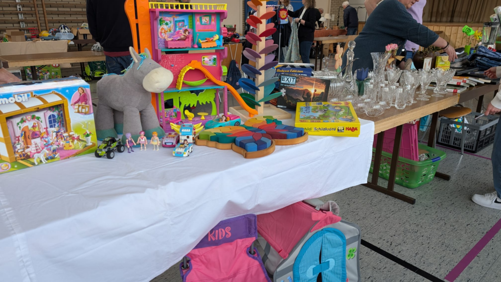 Am 21. März fand wieder ein Hallenflohmarkt in der TSGV Halle statt. Die Verkäuferinnen und Verkäufer waren bereits ab 11 Uhr da, damit ab 13 Uhr für die Besucherinnen und Besucher alles bereit stand. Ein buntes Angebot war vorbereitet: Geschirr, Bücher, Deko-Sachen, Spielsachen, Gesellschaftsspiele, Vasen, Puzzles, echter Schmuck und Modeschmuck, Kleidung für Erwachsene und Kinder und vieles mehr.